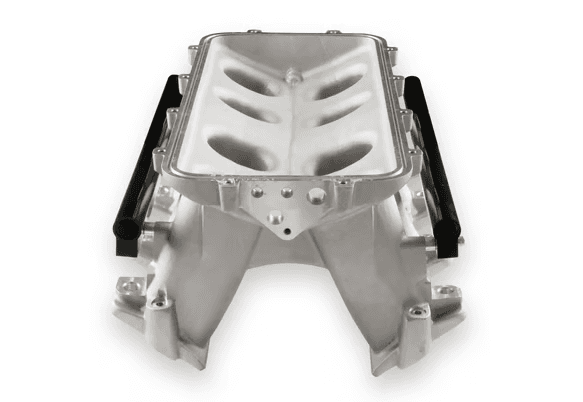 The base is designed to be modular in configuration to accept a wide range of carbureted and EFI tops and to be attractive to builders and fabricators as the foundation for custom induction systems. Runner length and the tapered cross-section designed to perform well for a wide range of engine configurations. EFI fuel rails are machined for -8AN O-ring fittings with passages large enough to accommodate high fuel flows and dampen pressure pulsations in the fuel system and come standard with EFI Hi-Ram kits. Cast aluminum construction. Intended for use on N/A or forced induction engines in the 6.0 to 7.0+ liter range, max power at 7000-8000+RPM.