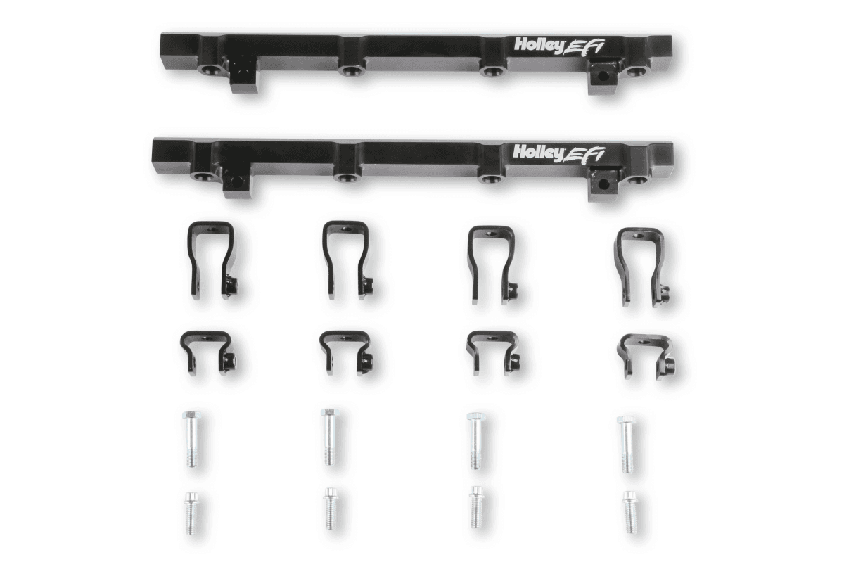 High volume fuel rails and mounting hardware included with ¾”-16 o-ring ports (8 AN)