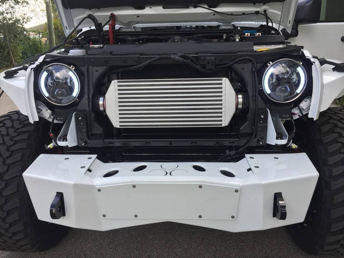 We decided to mount the intercooler directly behind the iconic Jeep grille, giving it maximum airflow exposure. This is the same intercooler used on our World Record setting Jeeps.