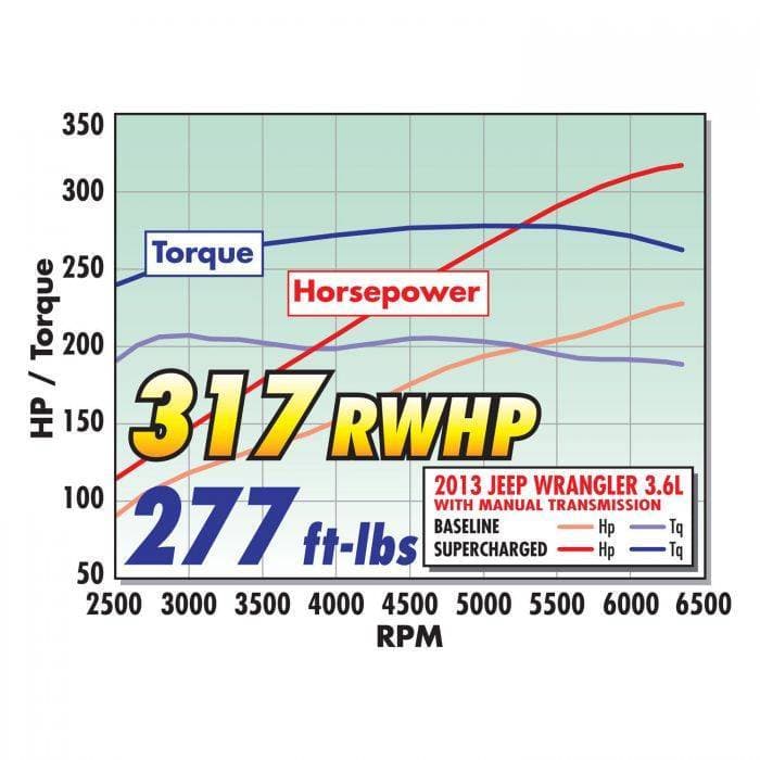 The Edelbrock Supercharger System #1527 for your 2012-14 Jeep Wrangler delivers 317 RWHP and 277 RWTQ for a manual and 303 RWHP and 262 RWTQ for an automatic. This Supercharger is exclusively for the Pentastar 3.6L V6 engine with a unique design and minimal components that makes it possible to fit under the stock hood. The core of each system is the Eaton Gen VI 1320 TVS rotating assembly with a four-lobe design having 160 degrees of twist for maximum flow, minimum temperature rise and quiet operation for excellent drivability. We also designed our superchargers with an integrated bypass valve to help eliminate parasitic loss under light throttle, improving mileage potential. Our unique and efficient inlet configuration results in a shorter, less restrictive intake path for improved airflow, without the need for a jack-shaft. Keeping the air cool is a high-capacity air-to-water intercooler and low-temp heat exchanger.