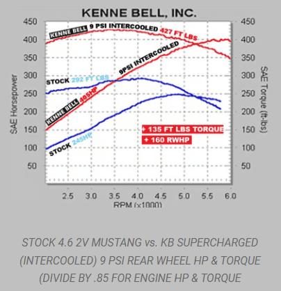 *Dyno Charts were tested using the Kenne Bell Cool Air Kit, 90mm Meter, 75mm Throttle Body “Big Tube” system along with this supercharger system