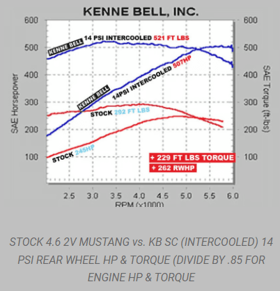 *Dyno Charts were tested using the Kenne Bell Cool Air Kit, 90mm Meter, 75mm Throttle Body “Big Tube” system along with this supercharger system