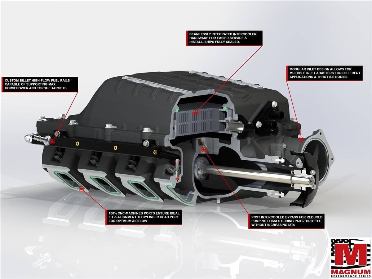 The intercooler, a custom fabricated design, allows for ultra-efficient post-supercharger air cooling. Placed atop the TVS2650 rotor group, the Magnum intercooler system features an all-new upper plenum, free from the constraints of the standard LSA style footprint, for a true “no-compromise” design. The large lid also features two dual coolant inlet and outlet ports to deliver ample coolant flow to the intercooler for lower air temps under any condition and any level of boost.