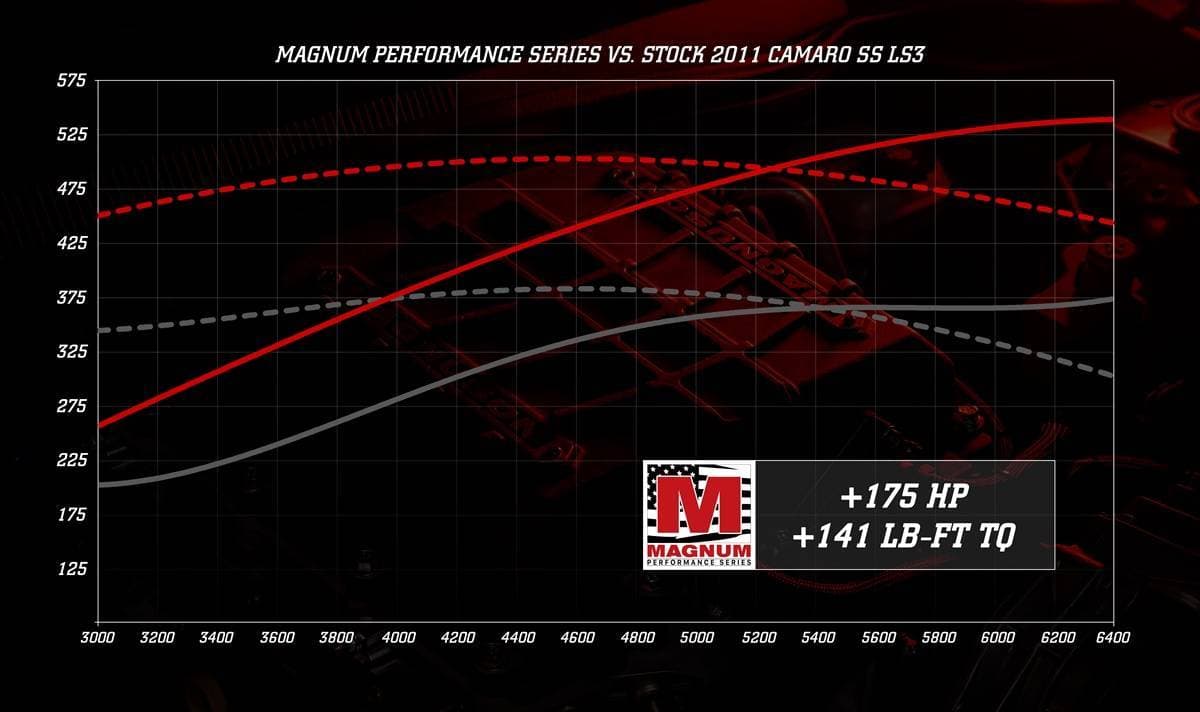 In testing, this all-new Magnum system added over 175 horsepower and more than 141 lb-ft of torque to a stock 2011 Camaro SS, with huge improvements across the entire RPM band. That’s a horsepower performance increase of more than 42% and a massive 30% increase in torque. That’s usable power you can feel on the track and on the street.