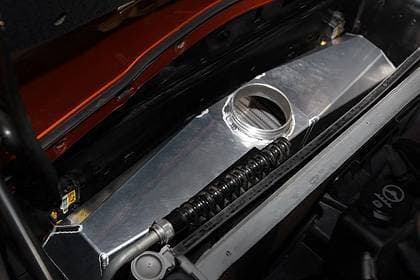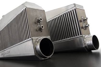 The core of this monster intercooler features a massive 4.5″ thick core section for maximum cooling area and low restriction. To make this possible, a custom bar and plate core is manufactured right here in the USA, designed to not only have great cooling abilities, but also the lowest pressure drop possible. Further flow enhancements include tapered, lightweight sheet-metal end tanks, and 3.5″ inlet and outlet connections.