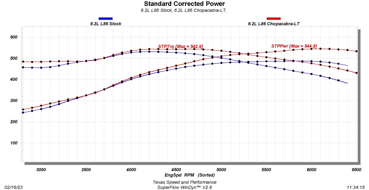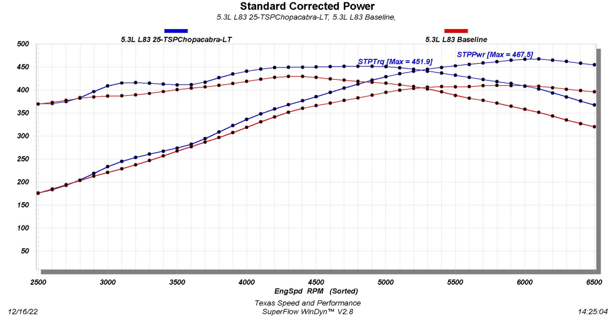 Power Increase: 5.3L: +58HP & 22FT/LBS. 6.2L: +59HP & 12FT/LBS (at the crank)