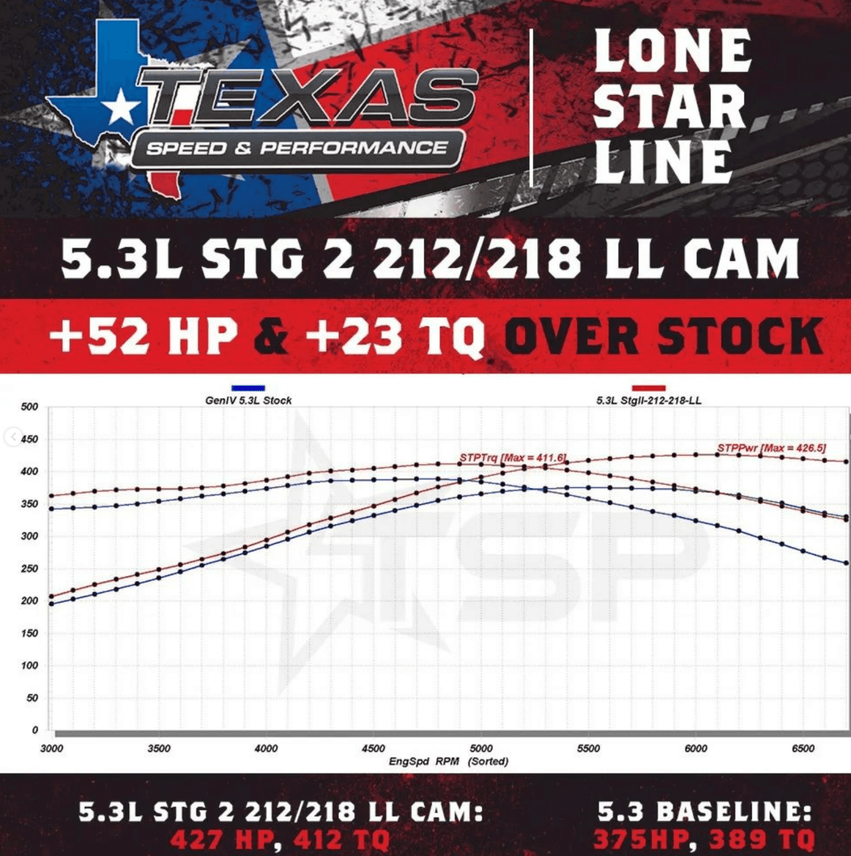 This cam gained 51.4 HP and 22.9 TQ at the flywheel on our in-house SuperFlow 902 engine dyno using an otherwise stock 5.3L engine! This cam uses proprietary TSP lobe profiles that are designed to utilize the factory GM LS6 single beehive valve springs and your factory pushrods, making them the most affordable cam package on the market! 1200-5800 RPM Power Band; This is an excellent performance camshaft with a smooth idle! We've had tons of customers select this camshaft when looking for a cam that drives almost stock and can be practically hidden with some exhaust systems! If you're looking for a small, stealth camshaft the 212/218 is a great option to consider. It is ideal for 4.8L, 5.3L, and 5.7L vehicles and works with a factory torque converter.
