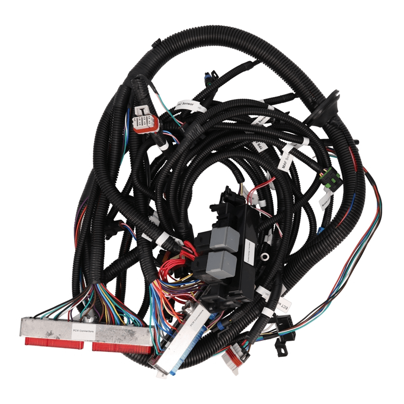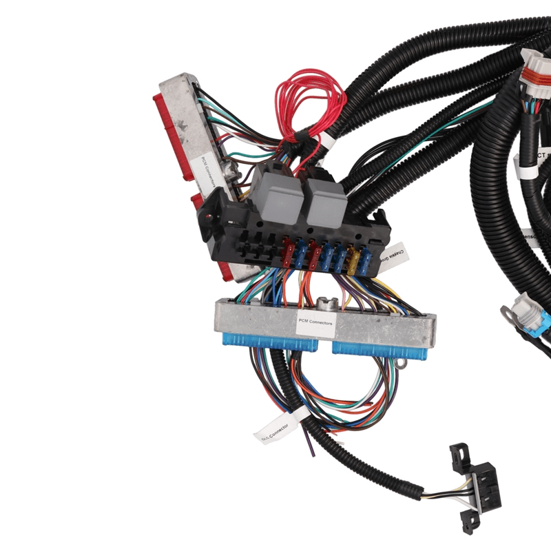 INCLUDED CONNECTORS: Fuse/Relay Box, Fuel Pump Control, Fan Controls, Check Engine Light, Speedometer, Tachometer, OBD2, Accelerator Pedal and Throttle Body Control, MAF Sensor, MAP Sensor, Engine Coolant Temp Sensor, Alternator Control, (2) Upstream Oxygen Sensors, Crankshaft Position, Camshaft Position, Fuel Injectors, Coil Packs, Manual or Automatic Transmission Control, Knock Sensors