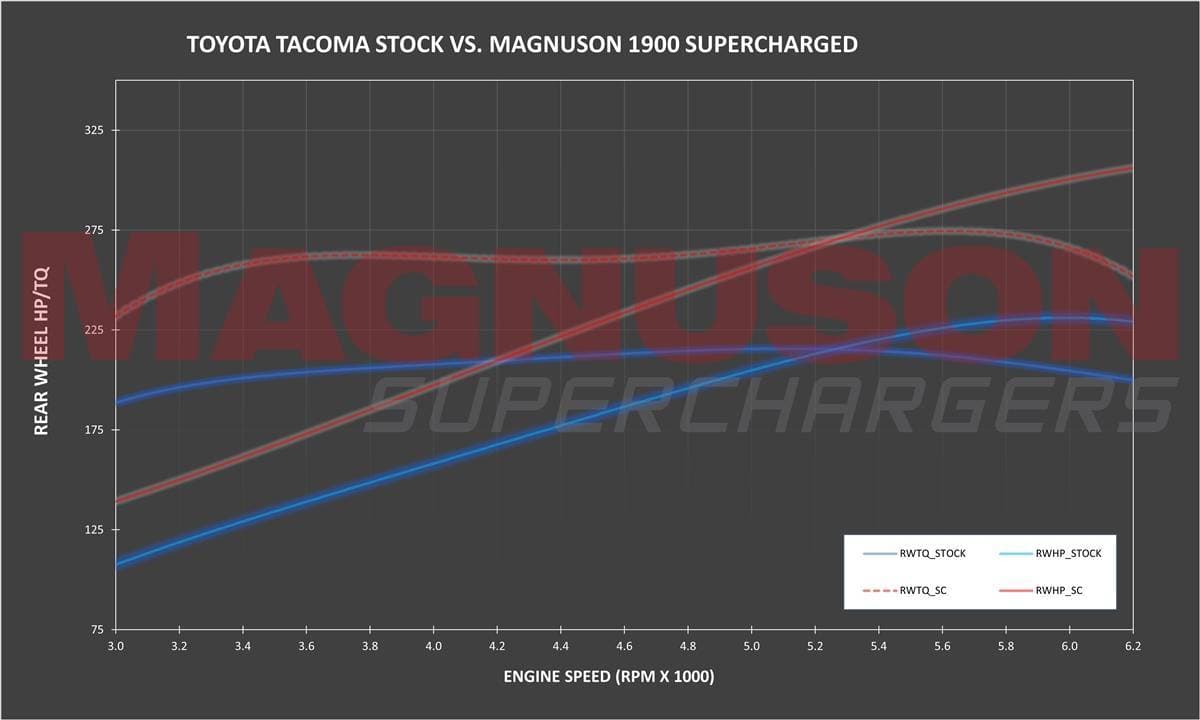 Introducing Magnuson’s all-new Toyota Tacoma TVS1900 Supercharger System designed exclusively for 2016 - 2023 MY vehicles equipped with the 3.5L V6 engine. Magnuson’s engineers have created a truly remarkable product by carefully matching a TVS1900 supercharger to operate in its peak thermal efficiency zone for the entire engine duty cycle. The result is super low inlet air temps for excellent gains in horsepower and torque, producing V8 levels of horsepower at an extremely affordable price.
