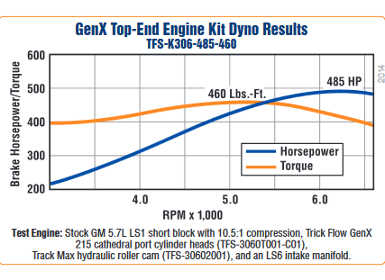 Stock GM 5.7L LS1 short block with 10.5:1 compression, Trick Flow GenX 215 cathedral port cylinder heads (TFS-3061T001-C01), Track Max hydraulic roller cam (TFS-30602001), and an LS6 intake manifold.