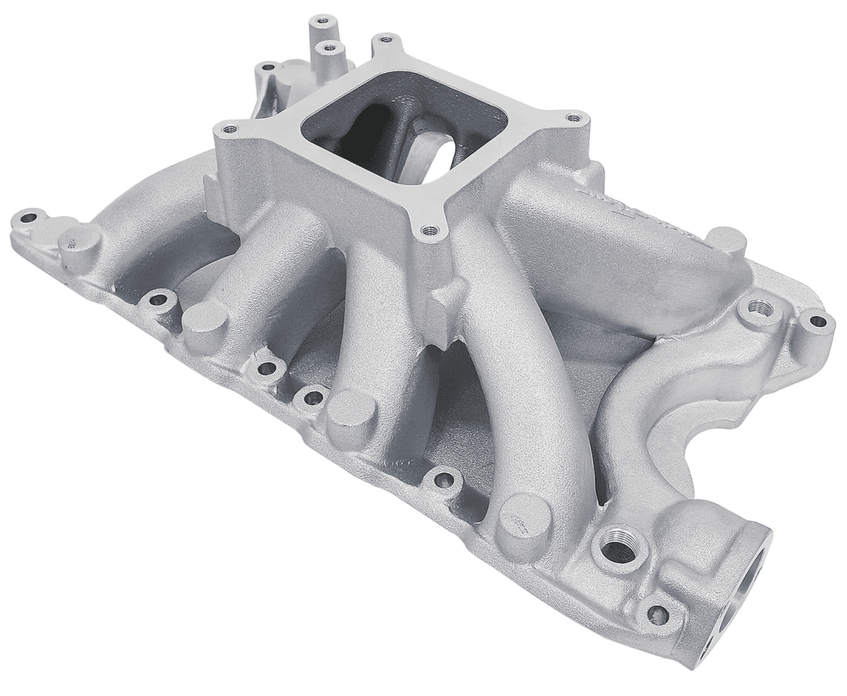 The A319 aluminum manifold's CNC Competition Ported runner treatment has been specially designed and machined with perfect port alignment on Twisted Wedge® 11R 227 cylinder heads. The high-flow, one-piece spider-type single plane design with raised plenum floor puts the powerband in the 3,500-7,500-plus RPM range. Integral bosses allow adding nitrous nozzles. Accepts Holley 4150-style square bore carburetors.