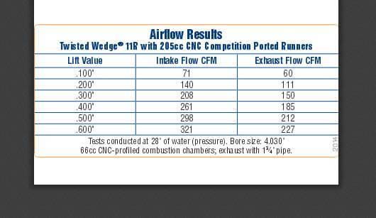 Trick Flow® Twisted Wedge® 11R 205 heads are direct replacements for previous Twisted Wedge® heads and work with all Twisted Wedge®-specific pistons. New high-velocity, race-inspired CNC Competition Ported runners have been optimized for today's popular bore and stroke combinations, and have a premium high-resolution finish for ultimate performance. Modified 11 degree intake and 13 degree exhaust valve angles and a restructured, CNC-profiled combustion chamber arrangement provide more airflow and performance potential.