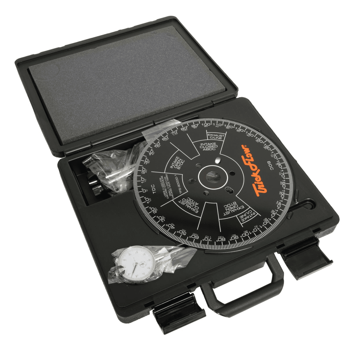 Trick Flow’s Cam Degree Kit will help dial in a camshaft accurately. In addition, the degree kits can also be used to check piston-to-valve clearance, flywheel runout, crankshaft endplay, and ring gear backlash. The 11 inch diameter black degree wheels feature laser-etched marks for easy reading and a one inch diameter center hole to accommodate aftermarket crankshaft sockets. Also included are two low-tension checking springs, a wire pointer, top dead center stop, three adapter bushings (3/8-, 7/16-, and 1/2 inch), flat washer, magnetic base, dial indicator, and a carrying case.