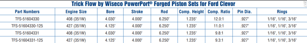 Trick Flow forged pistons are specifically designed to work with Trick Flow Twisted Wedge and Track Heat cylinder heads for Chevrolet and Ford engines. These fully skirted, lightweight pistons are precision-machined from premium 4032 aluminum alloy. They perfectly match the unique chamber and valve angles of the Twisted Wedge heads, making them ideal for more serious engine buildups.