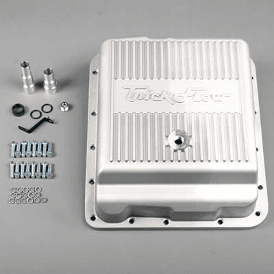 Trick Flow transmission pans hold between one to three extra quarts of fluid (depending on application) and are finned to help the transmission dissipate heat faster for maximum efficiency. Made from A319 cast aluminum for lightweight and durability, the pans come complete with mounting bolts, drain plug, filter extension, and a new gasket (where applicable).