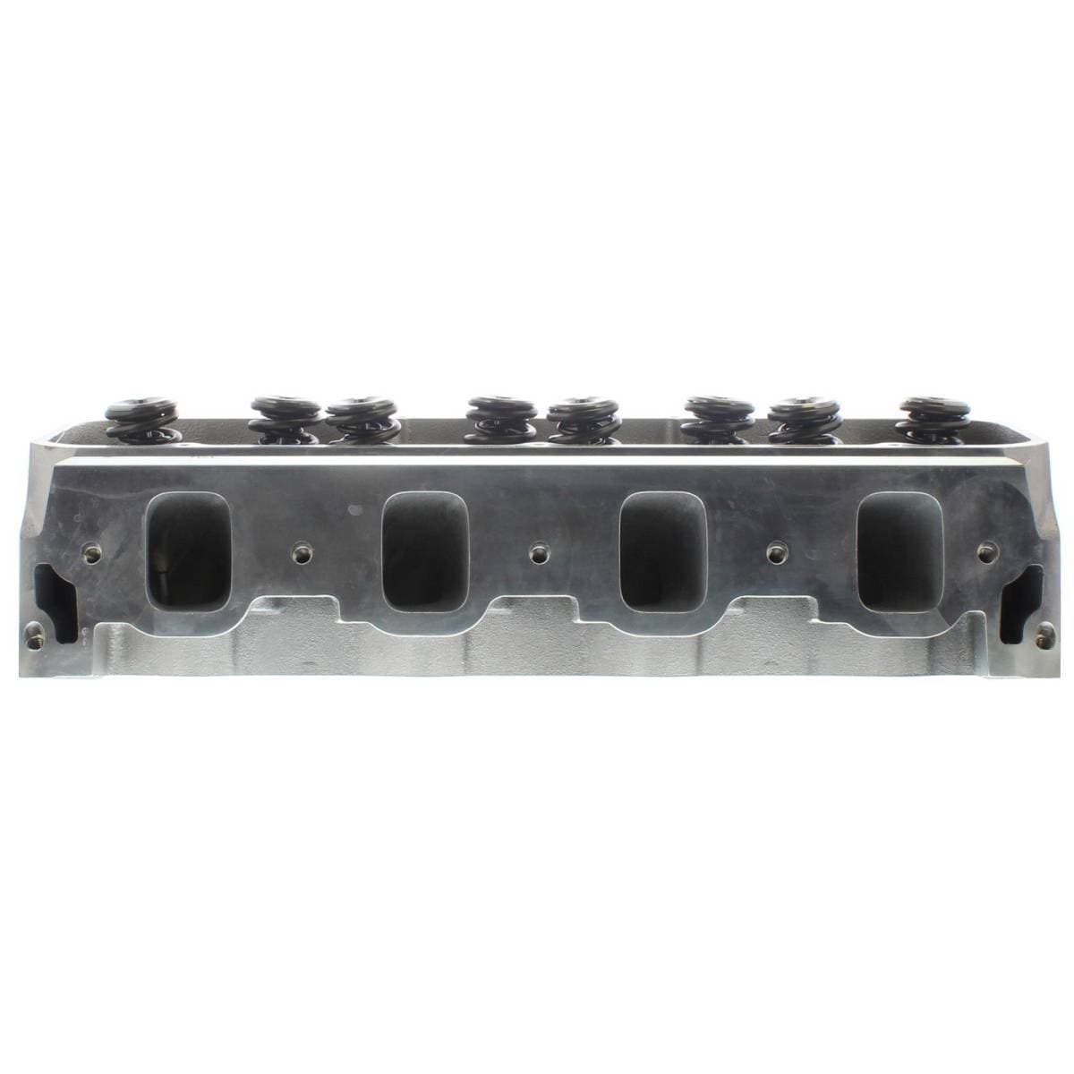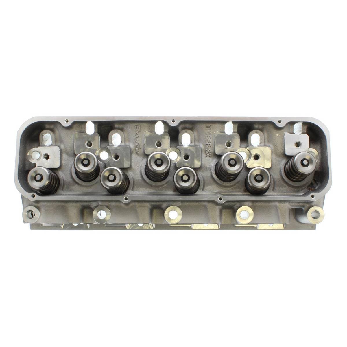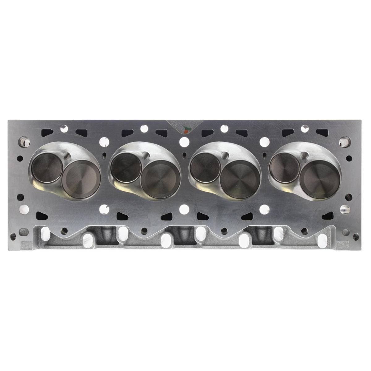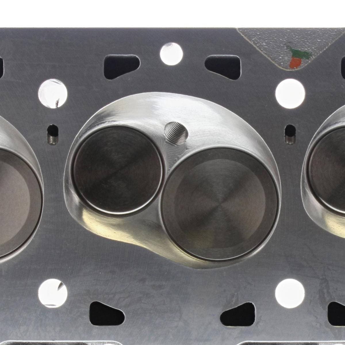 18-bolt cylinder heads are compatible with Ford Racing M-6010-A500 460 race block only. A460 specific intake manifold and custom-built headers required. Standard big block Chevy exhaust flange bolt pattern. Intake valves have 5/16 in. stems. The lightweight stainless intake valves in this head are optimized for NA engines only. Titanium valves are recommended for forced induction. Exhaust port is raised 1.5 in. over stock. Intake port is raised 1 in. over stock.