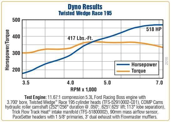 Trick Flow Twisted Wedge Race 195 heads have fully CNC Competition Ported runners with a premium high resolution surface finish for ultimate performance. Larger, stronger valves and race-duty valvetrain components give these heads 8,000-plus rpm capability. Other features include OE PI-style intake inlets, patented replaceable cam bearing journals (no more junking heads because of trashed cams!), 3/4" thick decks, and 3/4"-reach spark plugs.