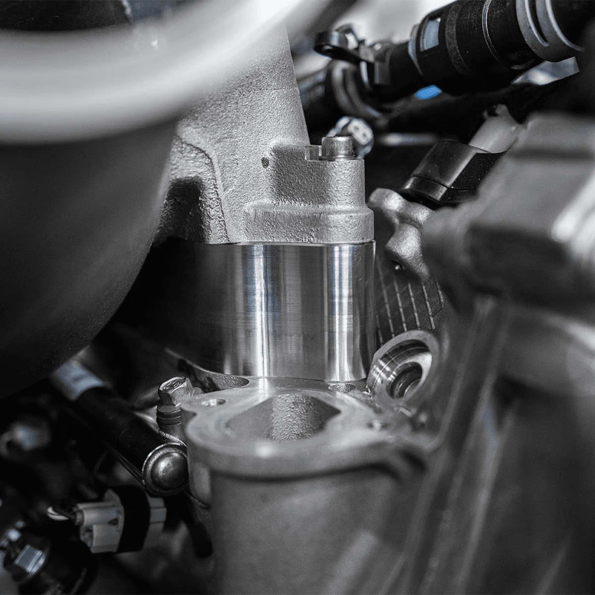 Utilizing the two included low profile direct injection rail bolts allow this kit to place the supercharger as low as possible to help with hood clearance. (Will not fit under a stock mustang hood without modifications)