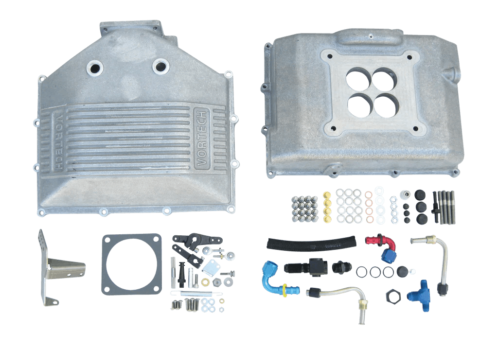 Vortech's cast aluminum carburetor enclosures for centrifugal superchargers are designed to bring the performance and compact fit of late-model fuel injected kits to vehicles with carbureted engines. In most cases, these kits will fit under your stock hood without modifications. The enclosure pressurizes the float bowls and throttle shafts for seamless response and are designed for use with Holley 4150, Quick Fuel Q-QFT-750-BAN, or Demon 750 MD carburetors. They also feature front and rear -8 AN fuel inlet ports, as well as provisions for pressure and vacuum connections. Linkage arms, a splined shaft, left and right hand spherical rod ends, and carburetor studs are included for simple throttle connection and adjustment.