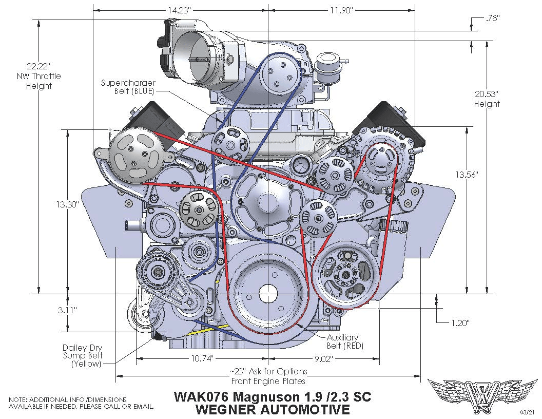 This is the Wegner 10 Rib Serpentine Drive System for LS3 Truck/Camaro's using Magnuson TVS1900/TVS2300 Hot Rod kit. with Power Steering, & Alternator(NO AC System). This kit comes complete with CNC Machined billet aluminum brackets and pulleys, CAD designed for maximum rigidity to eliminate component flex in high horsepower applications, CAD designed and CNC machined billet aluminum brackets and pulleys for maximum rigidity, eliminating component flex in high performance applications. Complete belt wrap with an extra idler pulley for NO slip operation. Internal fan alternator to cool better and allow more RPM. Dedicated 10 rib supercharger belt. Multiple blower pulley ratios depending on boost requirements
