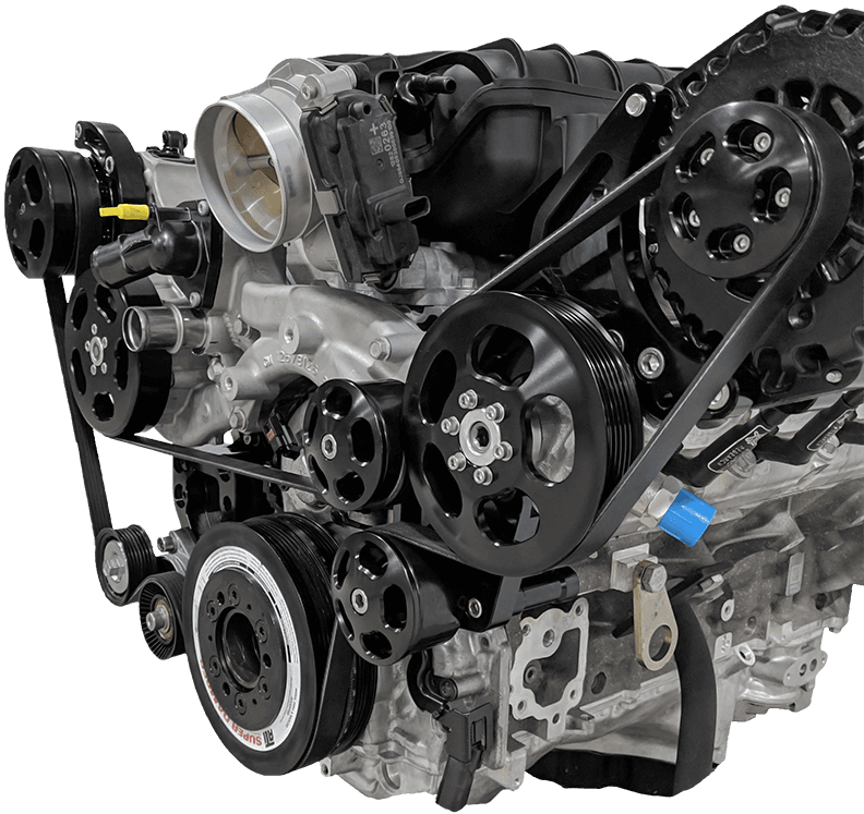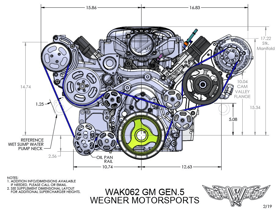 This is the Wegner 8 Rib Serpentine Drive System for LT1 6.2L Dry Sump Engine with Air Conditioning, Power Steering, & Alternator. This kit comes complete with CNC Machined billet aluminum brackets and pulleys, CAD designed for maximum rigidity to eliminate component flex in high horsepower applications, Complete belt wrap with an extra idler pulley for NO slip operation, An independent 8 rib belt drive for the supercharger, separate from all accessories, Also available for dry sump engines, OEM LT1 dry sump alignment, optional pulleys for dry sump engines and superchargers. The WAK062 LT1 Front Accessory Drive System is our newest design for the GM LT1 crate engine. Expertly designed and tested in house by our experienced engineers, this kit will take your LT1 engine to peak performance.