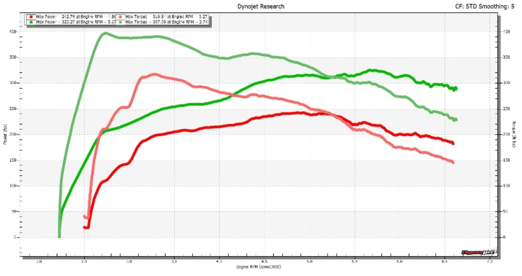 HP Gain: 100 horsepower gain and 130 foot pounds over stock! (on 93 octane)