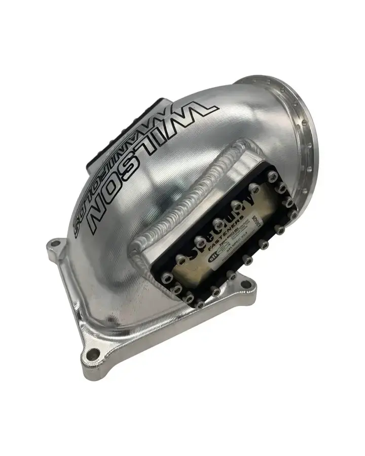 Wilson Manifolds' lightweight billet elbows provide the most efficient method of adapting their high-flow, single-bore throttle bodies to 4150 or 4500 series intake manifolds. Wilson Manifolds' elbows incorporate a computer-optimized transition from the throttle body to the intake manifold plenum for maximum airflow and distribution. Wilson Manifolds' elbows are CNC-machined to match each throttle body size. This elbow is designed to mate our 123mm billet throttle body (#471123V) to a 4500 series intake manifold. It utilizes a V-Band provision to mate the throttle body to the elbow. We offer the V-Band completion kit so that you can get the whole package in one place.