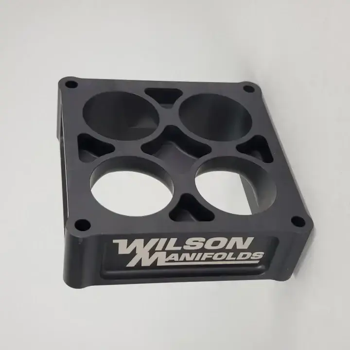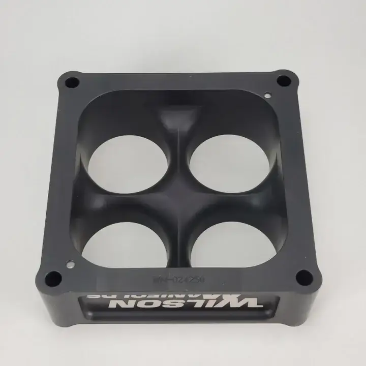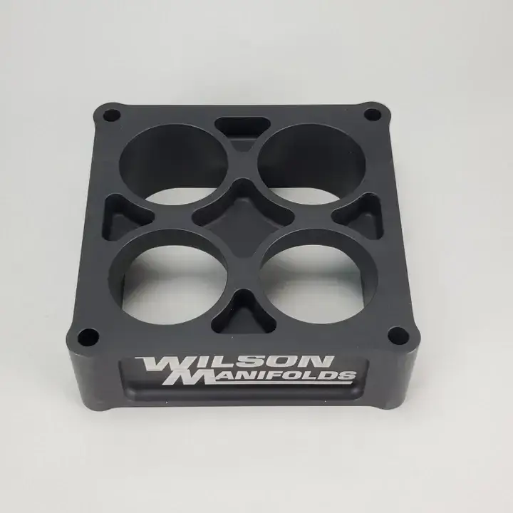 We offer the most complete line of 4-Hole Tapered spacers in 390, 4150, 4500, Q-Jet & 2bbl adapters to provide the high performance consumer with the ability to tune their engine for the maximum performance for any application. Wilson Manifolds is the only manufacturer to offer a choice of tapered spacer heights and produces the only fully CNC machined billet tapered spacer on the market. Wilson Manifolds Tapered spacers will benefit any vehicle that operates under both part and full throttle conditions such as bracket racing using a throttle stop, drag racing, circle track, road racing, off shore power boats, street/strip engines and towing vehicles.
