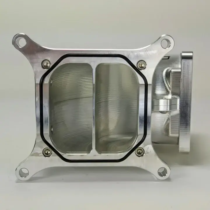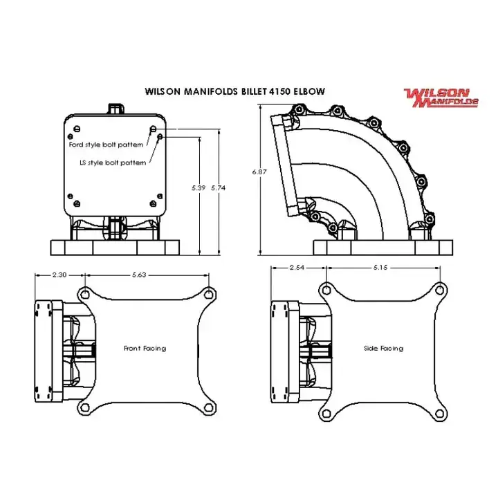 Wilson Manifolds 100 degree billet elbow made for 95-105mm throttle bodies and a 4150 intake manifold. This elbow has a divider inside to improve distribution, especially when paired with one of our throttle bodies. Seals with an o-ring on the base. Two ports included in the rear. This elbow can be used with either Ford or LS style throttle bodies.