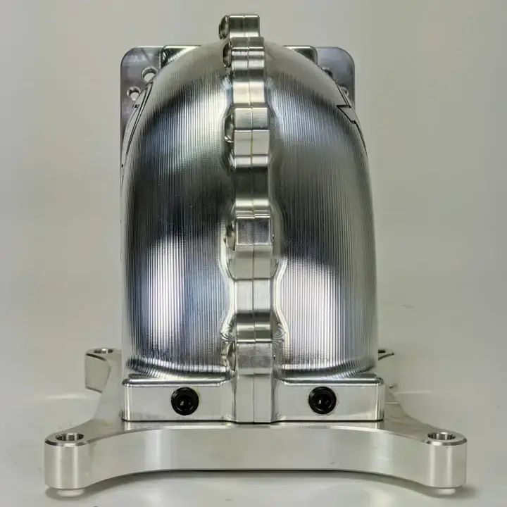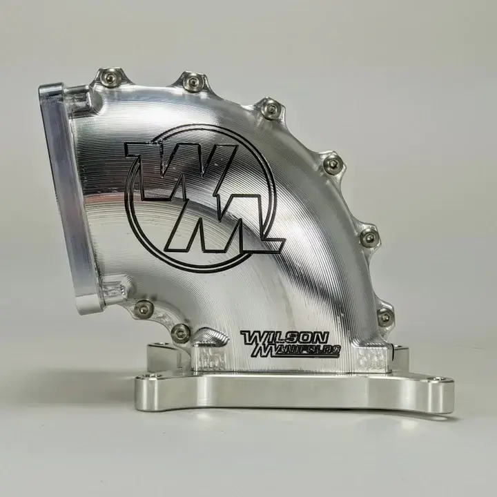 This is a Wilson Manifolds 95MM-105MM 4150 Side/Side Facing Billet Elbow With Divider - Silver Machined Finish