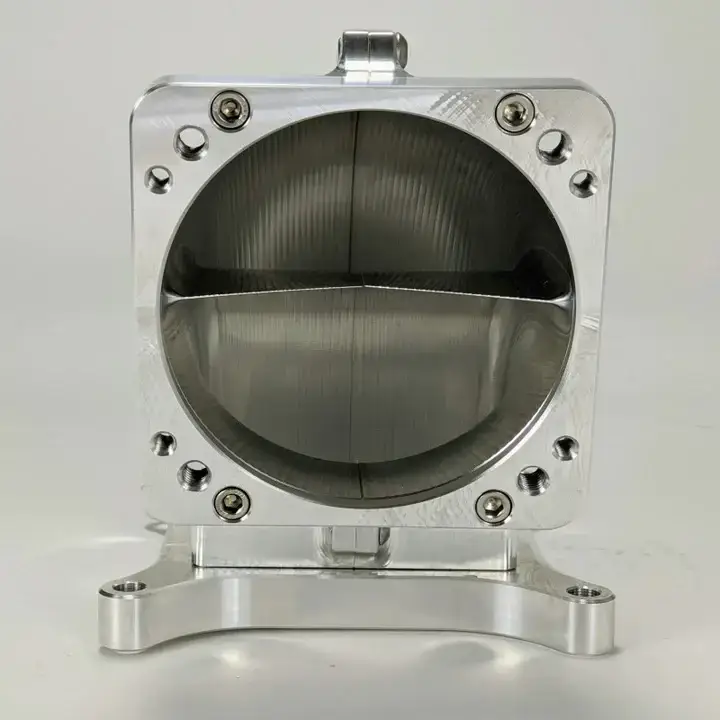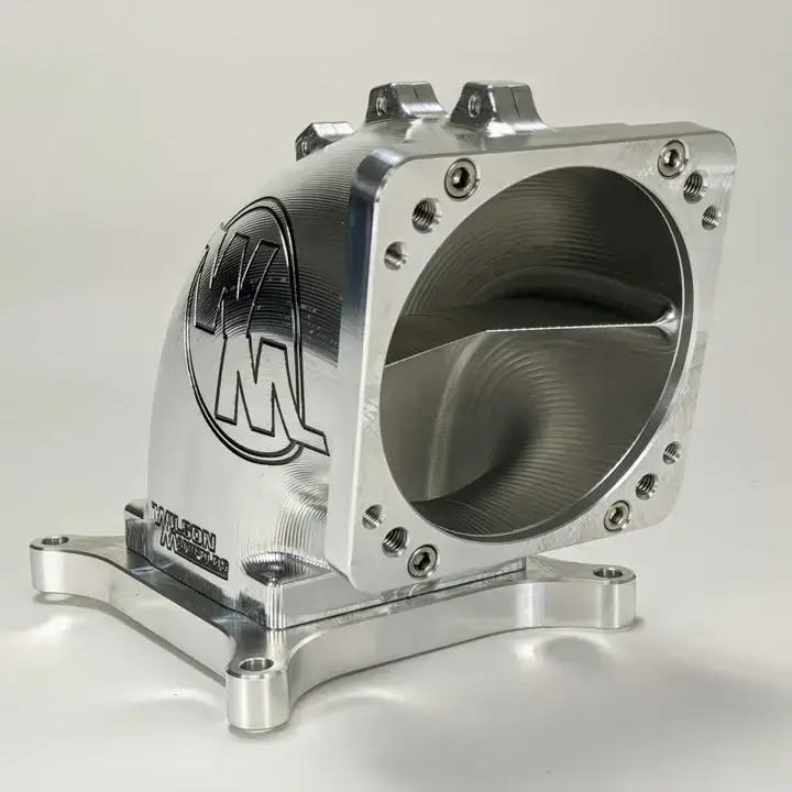 Wilson Manifolds 100 degree billet elbow made for 95-105mm throttle bodies and a 4150 intake manifold. This elbow has a divider inside to improve distribution, especially when paired with one of our throttle bodies. Seals with an o-ring on the base. Two ports included in the rear. This elbow can be used with either Ford or LS style throttle bodies.