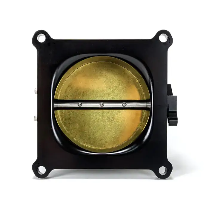 All billet construction. Uses a 105mm blade with an over sized radius for increased flow. Stainless steel ball bearings support a .500" machined stainless shaft. Height is 3.750" with a standard 4150 diameter top. Black anodized with lasered logo. Compatible with all nitrous plates. Flows an incredible 2000cfm!